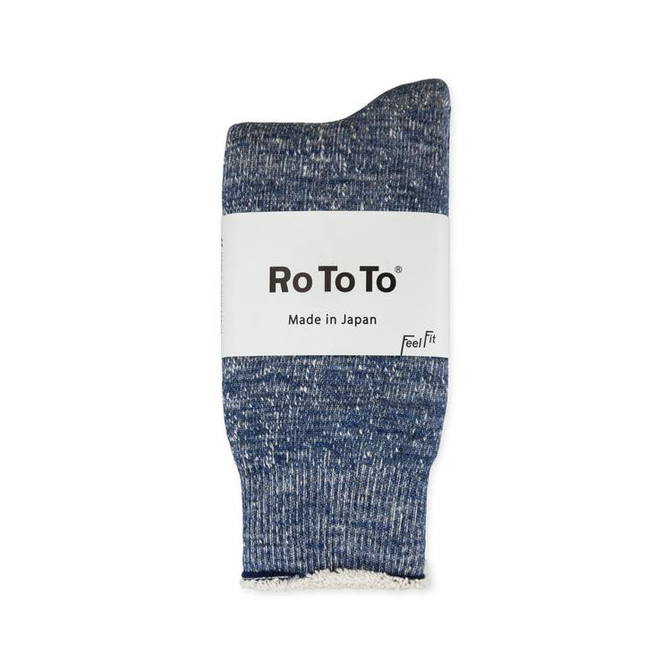 Inspired by hearty mountain climbing socks, these Rototo socks are like a sweatshirt. The double-layered "Double Face" design, is a process that allows for different materials to be knitted on the outside and the inside of the sock to utilize different thread properties. Using this production technique, merino wool on the outside and thick looped-back organic undyed cotton on the inside creates a comfortable texture and gives the joy of organic cotton against your skin.