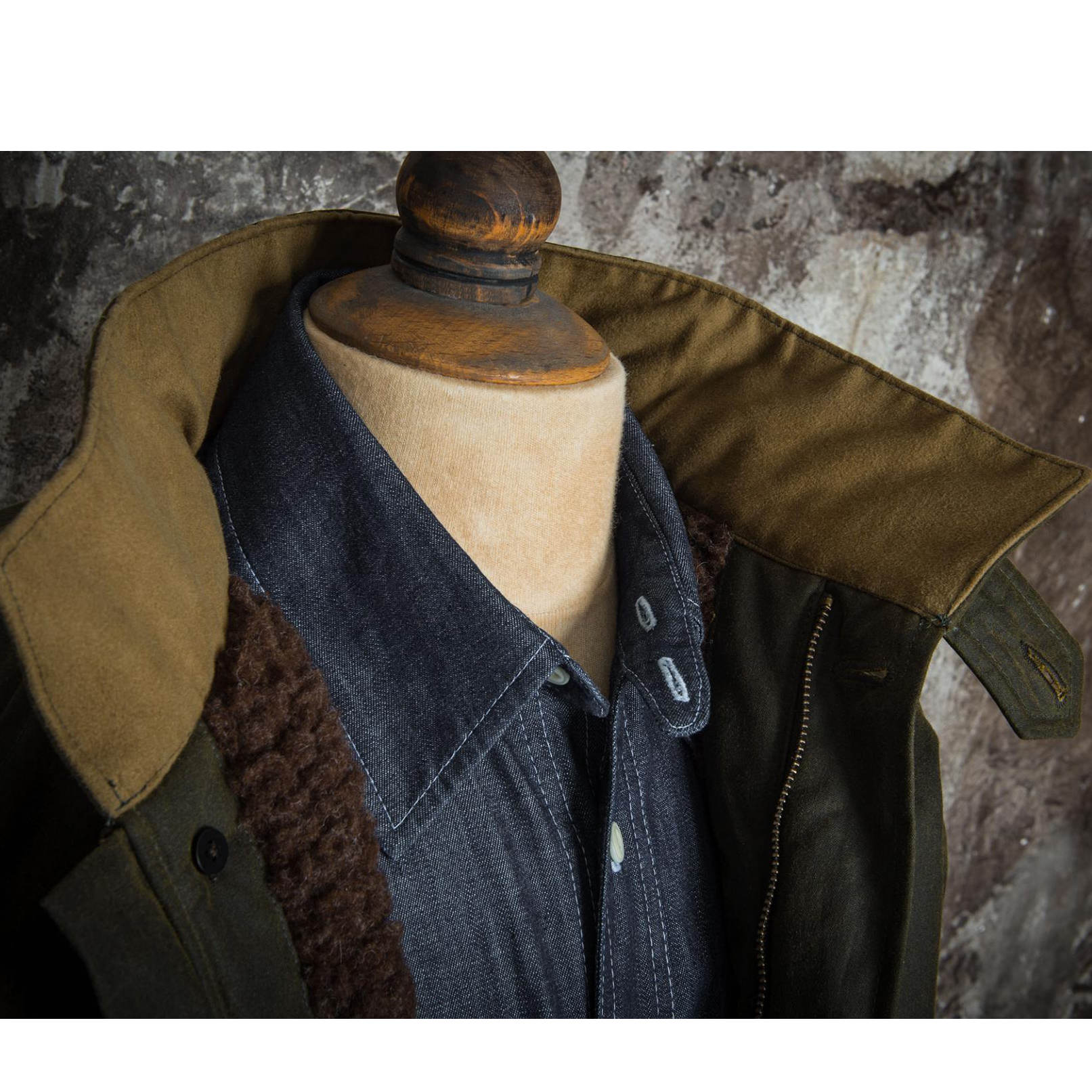 The Fleur de Bagne Falot winter jacket. A perfect combination of British Millerain waxed cotton and sheepskin lining.