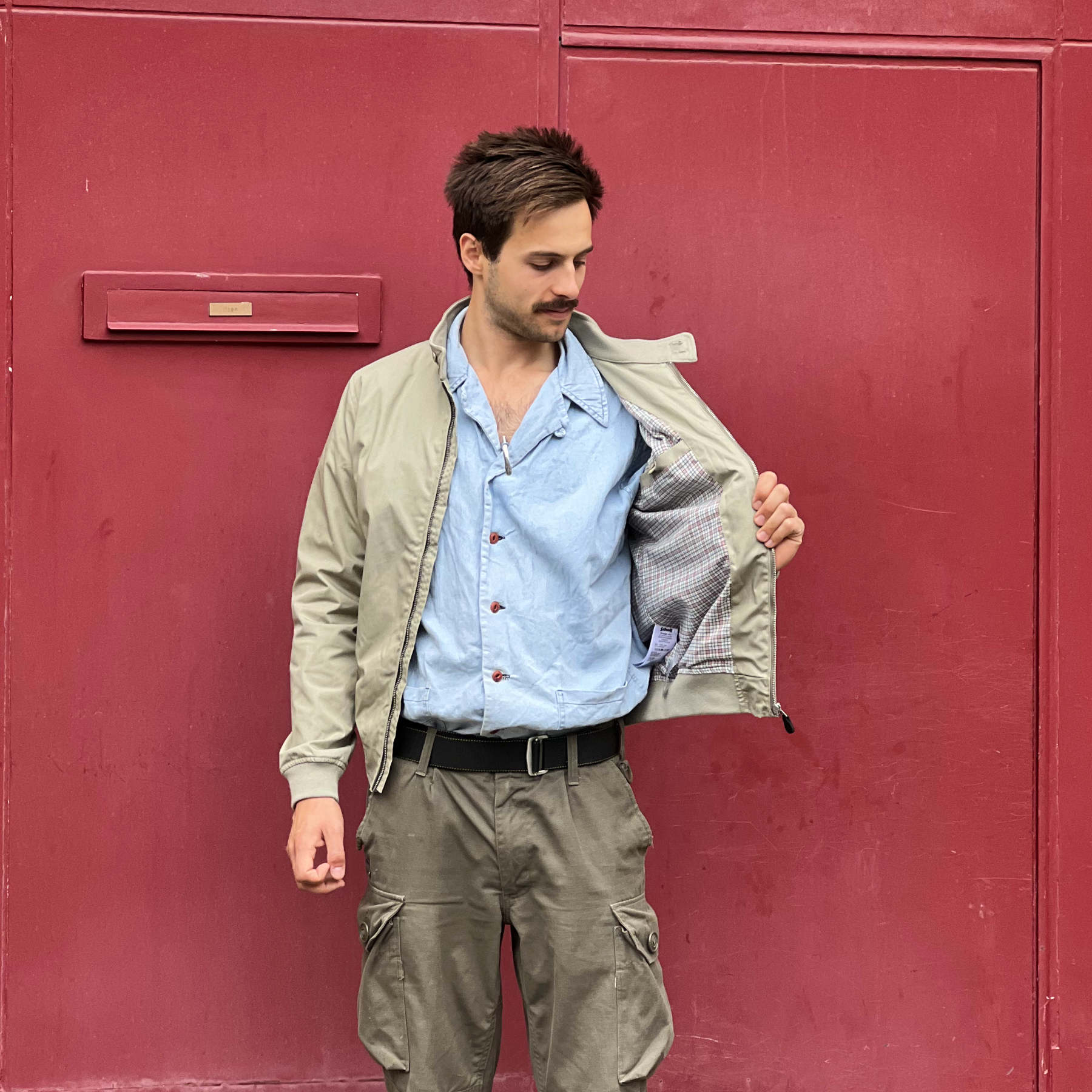 - Zippered front with buttoned collar