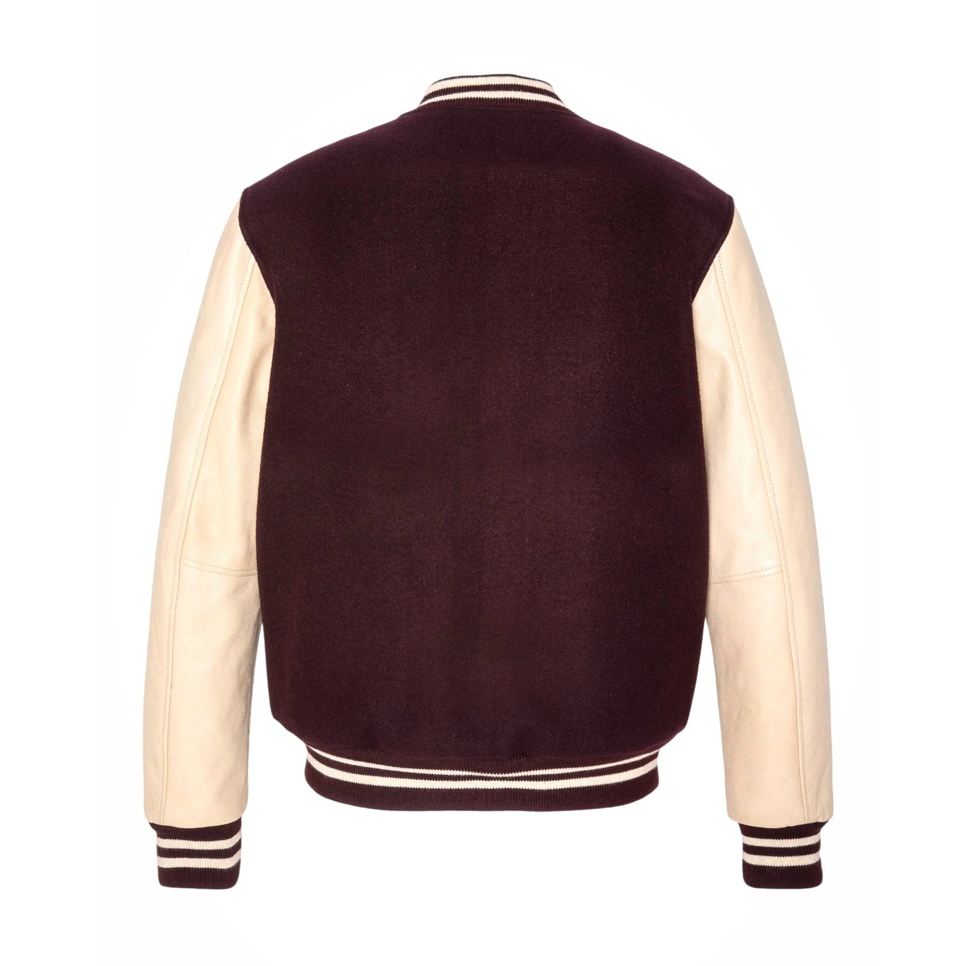 The jacket features a structured wool body combined with contrasting leather sleeves, a material pairing that has defined varsity jackets for generations. Ribbed cuffs and hem provide shape and comfort, while the front closure and practical pockets underline its functional, no-nonsense character.