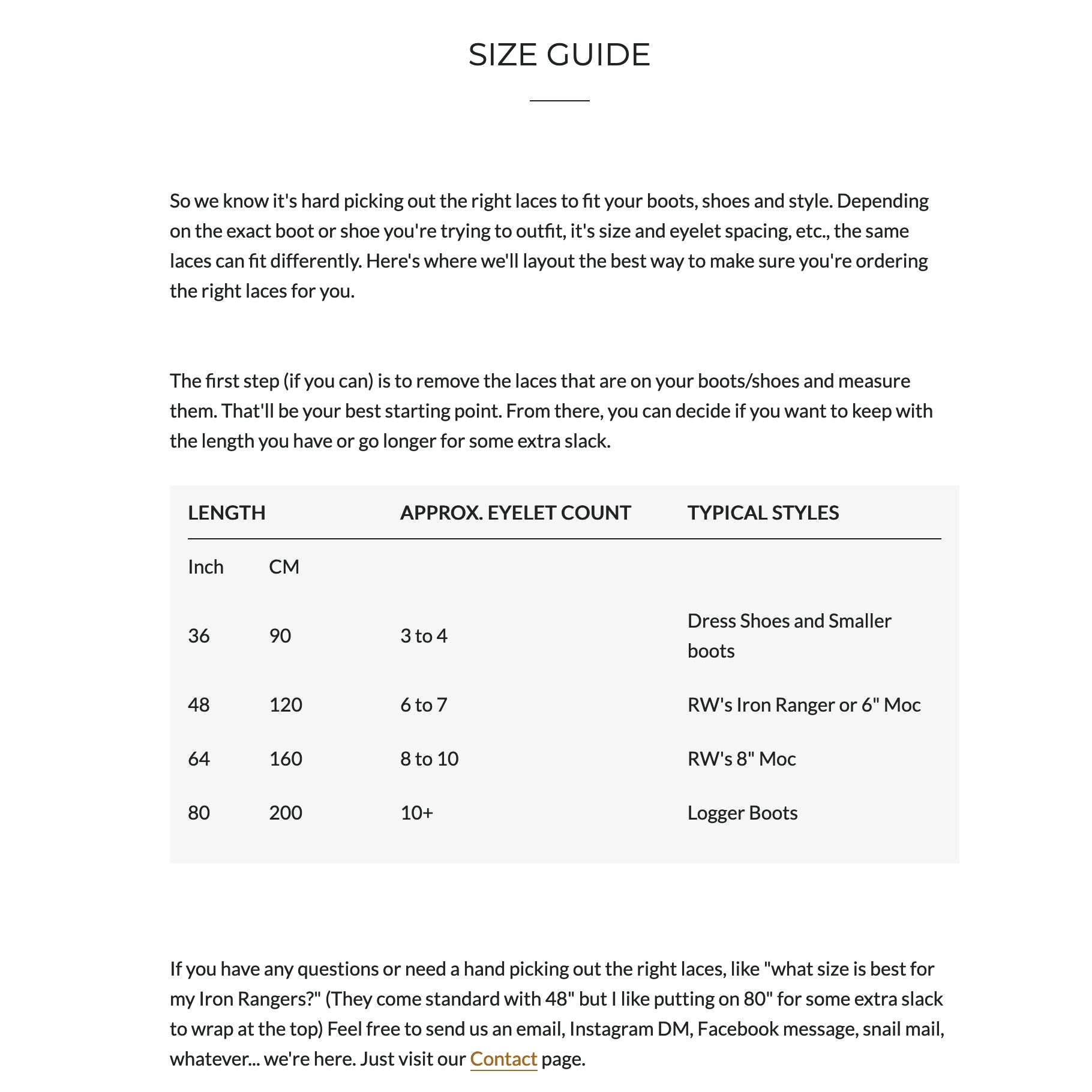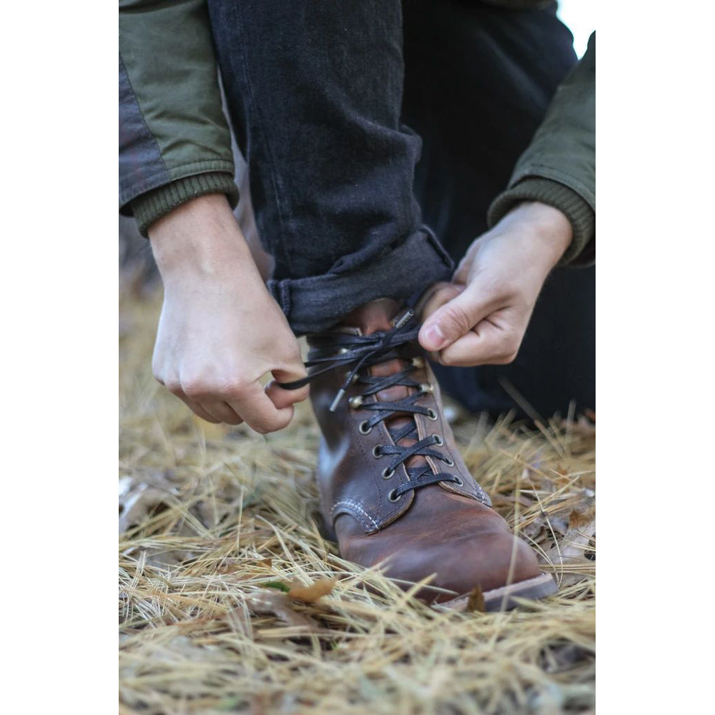 Die 160 cm (64er) flachen gewachsten Schnürsenkel sind in 4 Farben erhältlich und eignen sich perfekt für hohe Stiefel oder können sogar um die Oberseite kleinerer Stiefel gewickelt werden, um eine besonders sichere Schnürung zu erzielen. Unsere Lieblingsfarbe ist Grau auf braunen Stiefeln.