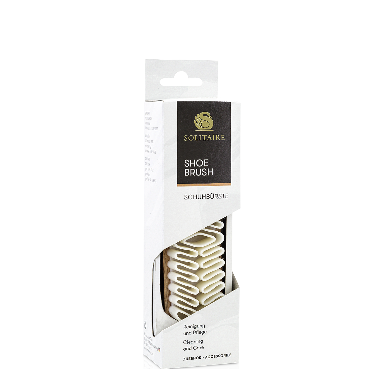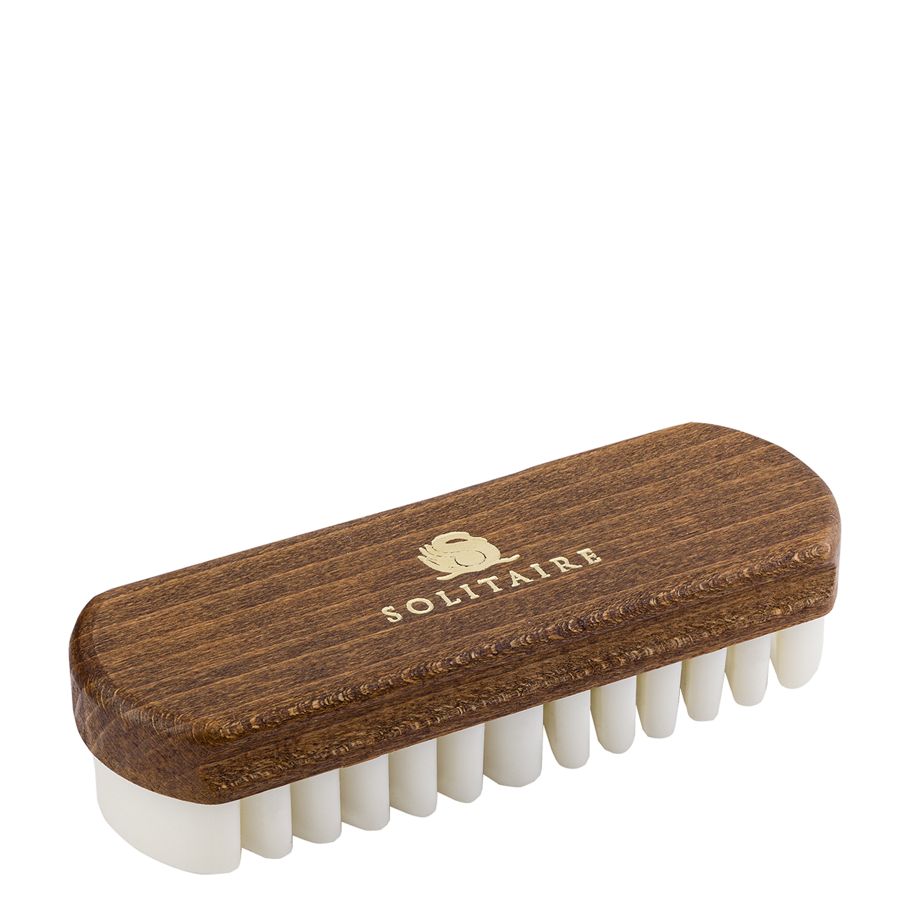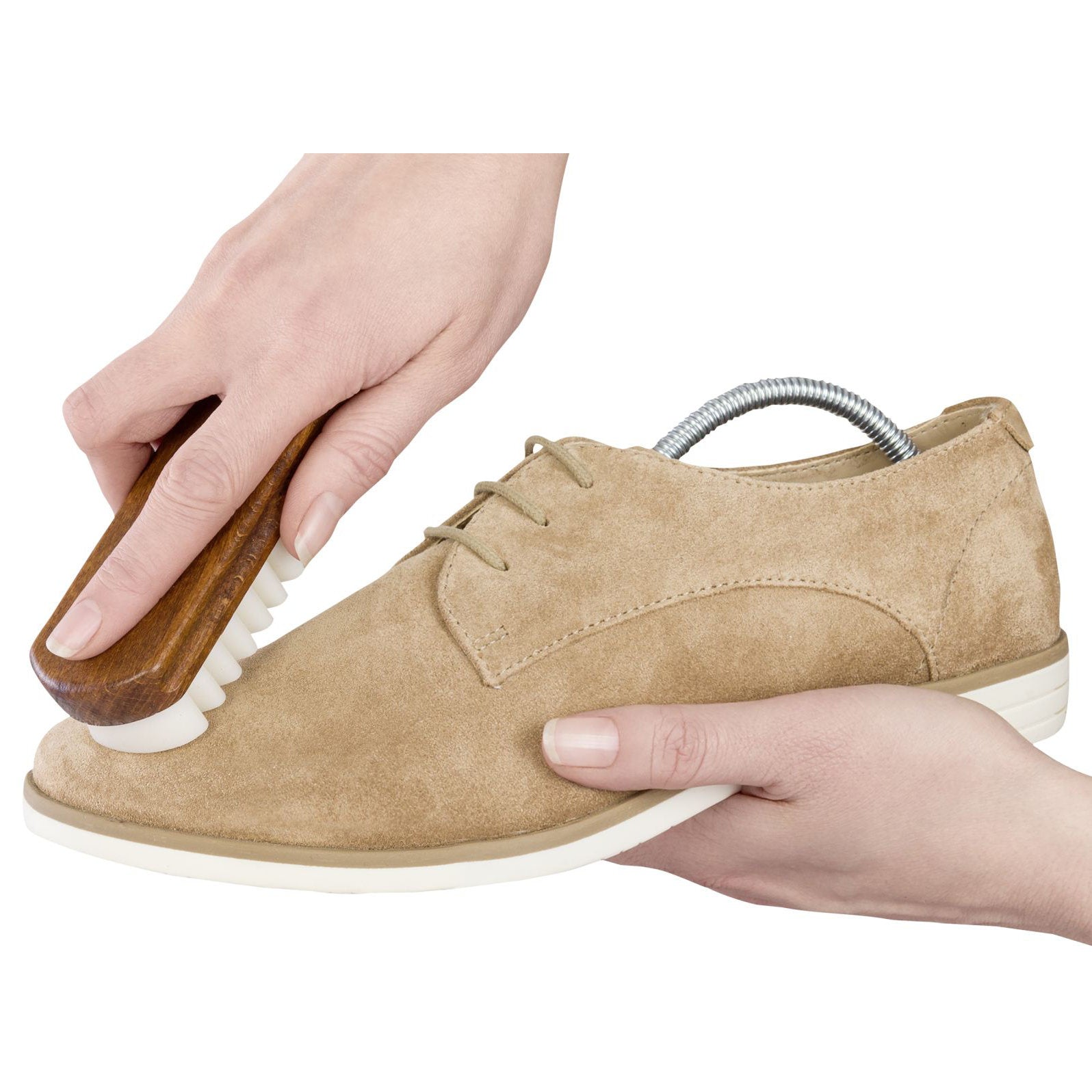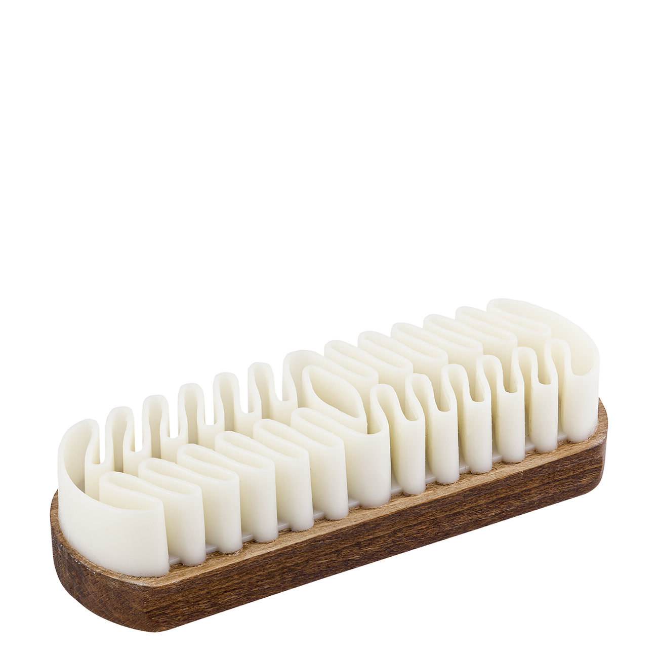 Entfernen Sie Schmutz und Straßenstaub von den Wildlederfasern. Verwenden Sie anschließend ein Pflegeprodukt, z. B. Solitaire Suede Nubuck Multicolour, und lassen Sie den Schuh vollständig trocknen. Bürsten Sie den Schuh abschließend mit der Kreppbürste, um die Fasern aufzufrischen. Die Lamellen der Bürste können mit Wasser und Seife gereinigt werden.
